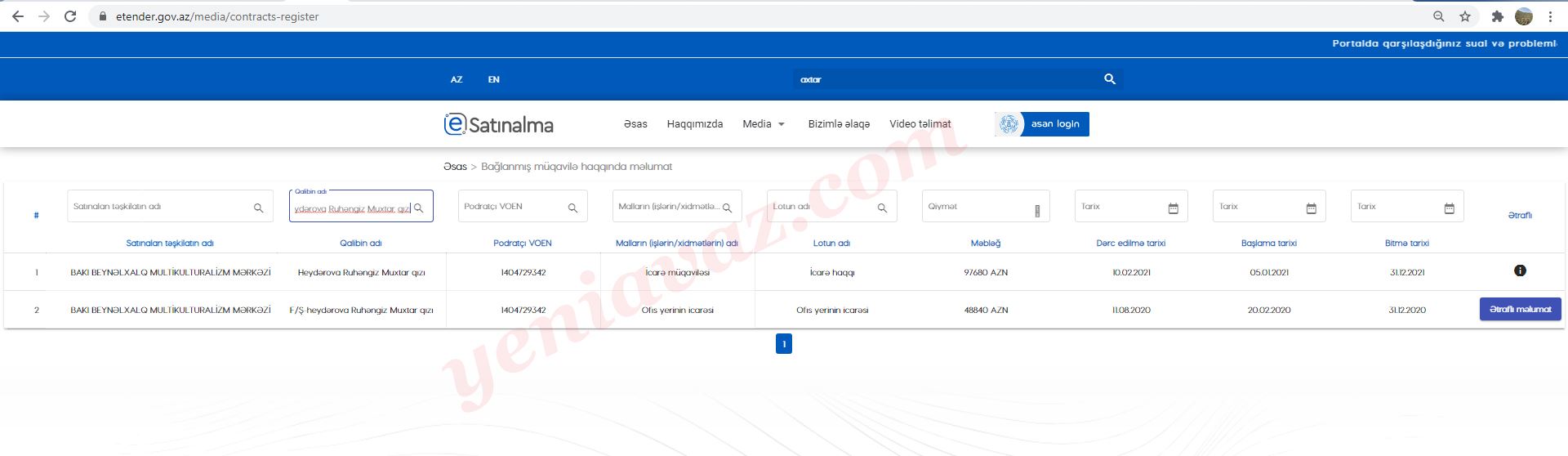 Onu da bildirək ki, Multikulturalizm Mərkəzi ötən il ərzində də ofisin icrası məqsədilə Heydərova Ruhəngiz Muxtar qızı ilə müqavilə imzalayıb. 20 fevral – 31 dekabr 2020-ci il tarixlərini əhatə edən icarə müqaviləsinin dəyəri 48 min 840 manat olub.