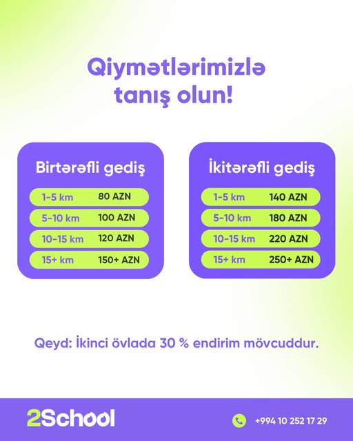 Oktyabrın 1-dən etibarən Bakıda məktəblilərin daşınması məqsədilə həyata keçirilən “2school” layihəsinin icrasına başlanılıb. Pilot mərhələdə layihə 8 dövlət və 3 özəl məktəb olmaqla ümumilikdə 11 təhsil müəssisəsini əhatə edir.