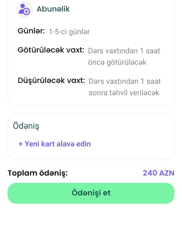 “Proqramı yüklədim, uşağım üçün hesablanan aylıq qiymət 240 manat göstərdi. Bu, ailə büdcəmiz üçün ağırdır. Taksi ilə uşağı daha ucuz qiymətə apara bilərəm”, –  valideyn anews.az-a bildirib.