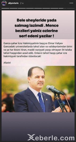 Anews.az moderator.az-a istinadən xəbər verir ki, prodüser icra başçısının Gəncədəki universitetlərdə təhsil alan, valideyninin birini və ya hər ikisini itirmiş 54 tələbəni təhsil haqqından azad etdiyini bildirib. Onların təhsil haqqı isə Şəhər İcra Hakimiyyəti tərəfindən ödənilib. Tolik bu faktı qeyd etməyin vacib olduğunu da əlavə edib.