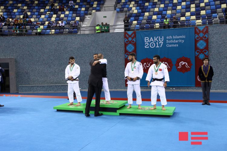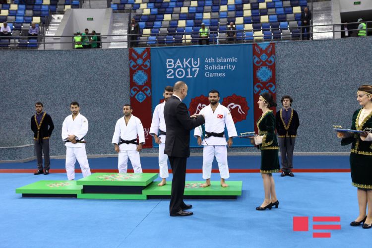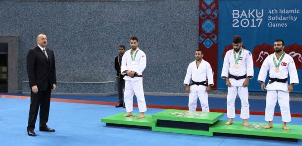 Prezident İlham Əliyev Bakı-2017 IV İslam Həmrəyliyi Oyunlarında 66 kq çəki dərəcəsində mübarizə aparan cüdoçuların mükafatlandırma mərasimində iştirak edib.