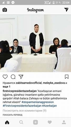 BAKU.WS-in məlumatına görə, Mehriban Əliyeva qeyd edib ki, Azərbaycan erməni işğalına, günahsız insanların qətlinə qarşıdır. "Allah balaca Zəhraya və bütün şəhidlərimizə rəhmət eləsin!”, - deyə birinci vitse-prezident qeyd edib.
