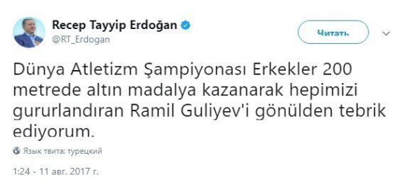 Türkiyə prezidenti Rəcəb Tayyib Ərdoğan azərbaycanlı idmançı Ramil Quliyevi Londonda keçirilən dünya çempionatındakı qələbə münasibəti ilə təbrik edib.