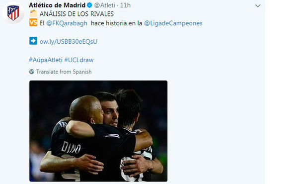 UEFA Çempionlar Liqasının qrup mərhələsində "Qarabağ”ın rəqibi olan İspaniyanın "Atletiko” klubu Azərbaycan təmsilçisi haqqında "Twitter”də paylaşım edib.