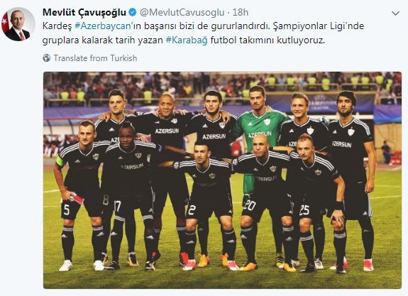 Türkiyənin xarici işlər naziri Mövlud Çavuşoğlu "Qarabağ” klubunu Çempionlar Liqasının qrup mərhələsinə adlaması münasibətilə təbrik edib.