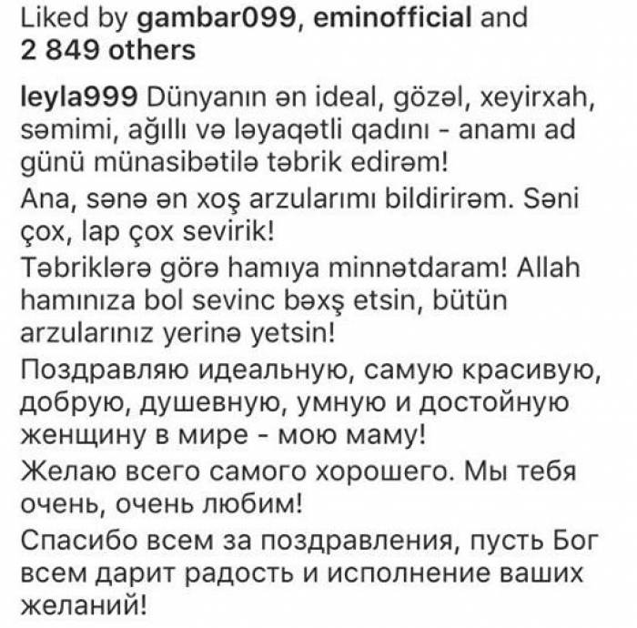 "Dünyanın ən ideal, gözəl, xeyirxah, səmimi, ağıllı və ləyaqətli qadını – anamı ad günü münasibətilə təbrik edirəm.