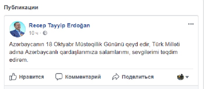Türkiyə prezidenti Rəcəb Tayyib Ərdoğan Azərbaycan xalqını 18 oktyabr Müstəqllik günü münasibəti ilə təbrik edib.
