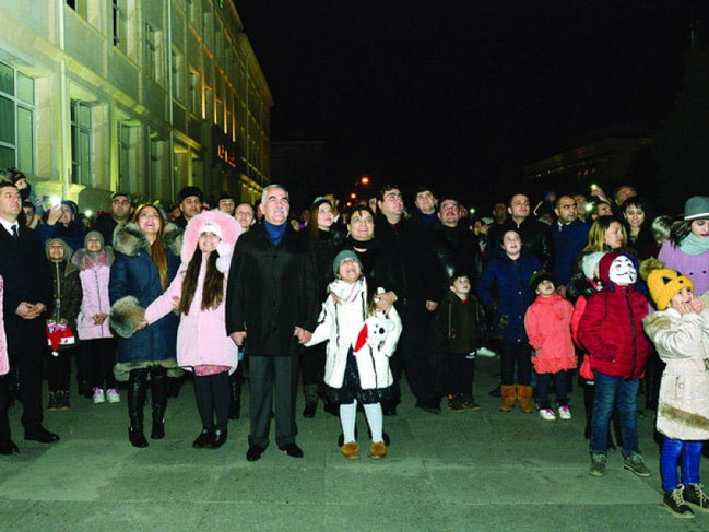 Azərbaycan Respublikasının Prezidenti İlham Əliyevin Dünya Azərbaycanlılarının Həmrəyliyi Günü və Yeni İl münasibətilə Azərbaycan xalqına televiziya vasitəsilə təbriki mərkəzi meydanda quraşdırılan monitor vasitəsilə yayımlanıb. Dövlət başçısı deyib: "Qarşımızda duran bütün vəzifələri icra etmək üçün güclü iqtisadiyyat lazımdır. Biz bu istiqamətdə də bu il çox fəal işləmişik. 2017-ci il tarixdə dərin, köklü və nəticə verən iqtisadi islahatlar ili kimi qalacaqdır. Ölkələrin iqtisadiyyatlarının rəqabətqabiliyyətliliyinə görə Azərbaycan dünya miqyasında 35-ci yerdədir. Bu, ilk növbədə, onu göstərir ki, ölkəmizdə aparılan çox ciddi islahatlar gözəl nəticələr verir. Bu il iqtisadiyyatın qeyri-neft sektoru 2 faizdən çox, iqtisadiyyatımızın qeyri-neft sənayesi 3 faizdən çox, kənd təsərrüfatı isə 4 faizdən çox artmışdır... Bir sözlə, 2017-ci il ölkəmiz üçün uğurlu olub, əminəm ki, gələn il də uğurlu olacaqdır".