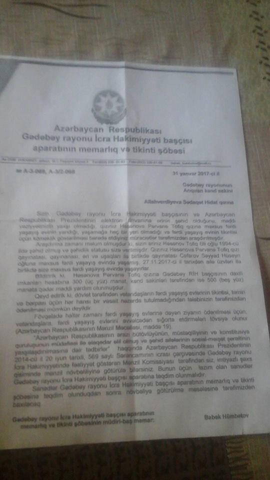 Xatırladaq ki,Allahverdiyevanın ailəsinə bütün şəhid ailələrinə verilən ev və torpaq sahəsi ayrılmayıb. Gədəbəydə şəhid ailələri üçün tikilən binada ev paylanan zaman icra hakimiyyəti ancaq 3-4 min manat məbləğındə rüşvət verən ailələri evlə təmin edib. Səqadət Allahverdiyevaya isə onun təbirincə desək ancaq boş söz vəd ediblər.