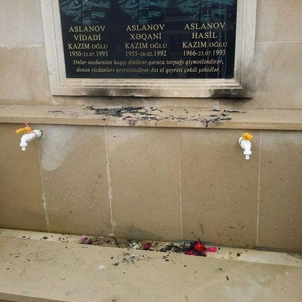 "Bir neçə gün öncə naməlum şəxs lövhənin önünə qoyulmuş gülləri qıraraq yandırıb. Daha sonra isə o, bir neçə fənəri sındıraraq daş üzərində xaç çəkib”, - deyə Xəqani Aslanovun oğlu bildirib.