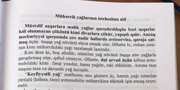 Digər səhifədə müəllif mühərrik yağlarından yazaraq belə bir nəticəyə gəlir:
