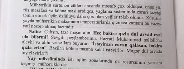 "Çalışın təzə maşın alın. Heç bakirə qızla dul arvad eyni ola bilərmi? Sevgili peyğəmbərimiz Həzrəti Muhəmməd səlləlləhu əleyhi və alihi və səlləm buyurur: "İstəyirsən cavan qalasan, bakirə qızla evlən”. Bəziləri köhnə maşın alanda xalat istəyirlər. Məgər dul arvada toy edirlər?”.