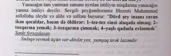 "Dörd şey insanı cavan ikən qocaldar, bəzən də öldürər: 1-ci tez-tez cinsi əlaqədə olma; 2-ci toxqarına yemək; 3-cü toxqarına çimmək; 4-cü yaşlı qadınla evlənmək. Sanki forsajdasan”.