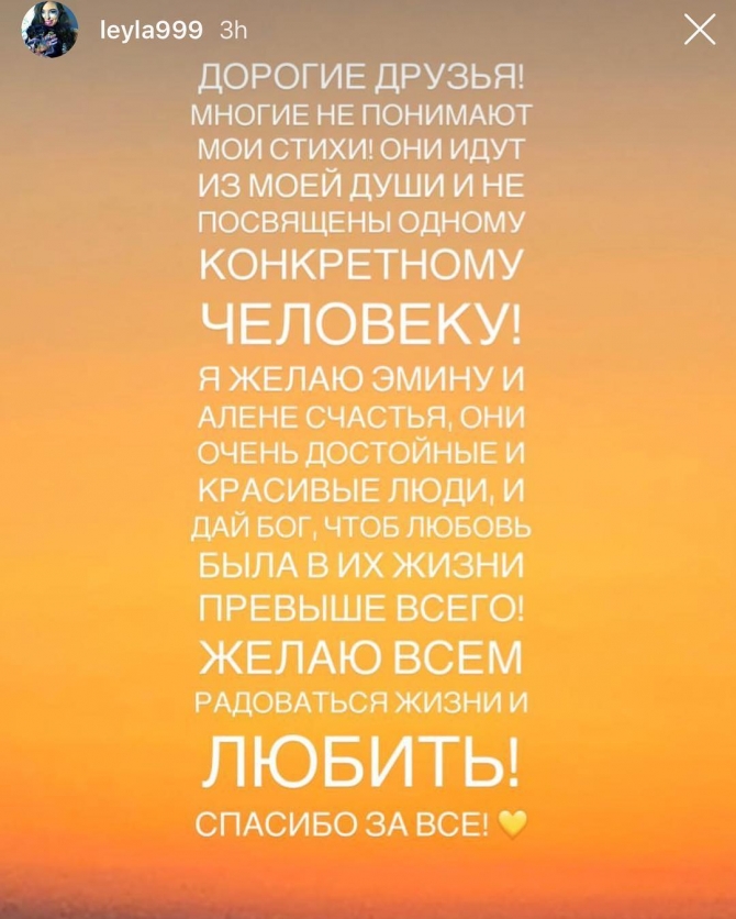 Mən Eminə və Alyonaya xoşbəxtlik arzulayıram. Onlar çox ləyaqətli və gözəl insanlardır. Allah onların sevgisini həyatlarında hər şeydən üstün etsin! Hər kəsə həyatdan zövq almaq və sevmək arzulayıram! Hər şeyə görə çox sağ olun!"