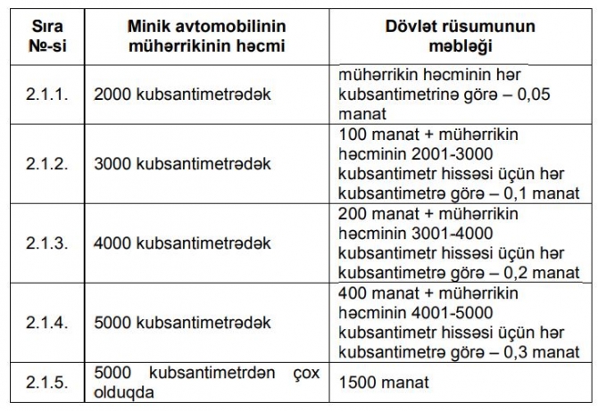 Minik avtomobillərinin dövlət qeydiyyatına alınmasına görə dövlət rüsumu aşağıdakı məbləğlərdə müəyyən edilir: