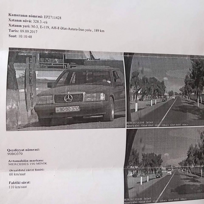 Belə ki, sürət həddi 60 km/saat olan yolda 110 km/saatla hərəkət edən YPX avtomobilinin əvəzinə radara yolun sağ tərəfində baqajı açıq şəkildə dayanan 90-BO-370 dövlət qeydiyyat nişanlı "Mercedes 190” markalı avtomobil düşüb və cərimə bu avtomobilə tərtib olunub.