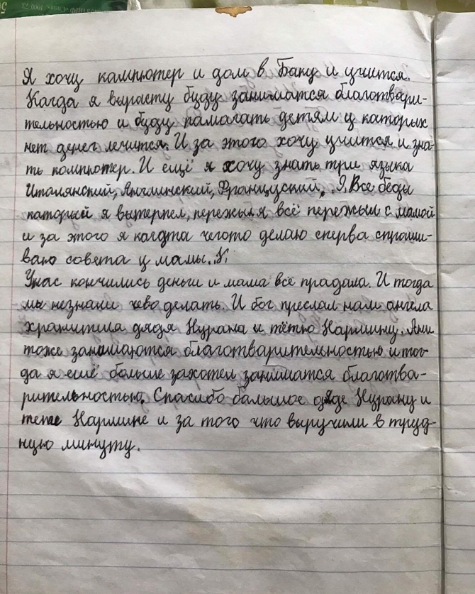 "09.08.2018. Bu gün zamanında yardım etdiyimiz, xərçəng xəstəlikdən əziyyət çəkən Məhəmmədin (09.08.1993 - 23.09.2005) doğum günüdür. Yaşasaydı, 25 yaşı tamam ola bilərdi. Reyhan Qurbacova Allah oğlunu rəhmət eləsin. Allah səbr versin. P.S.: Onun 2004-cü ildə yazdığı məktubunu oxuyarkən göz yaşlarını saxlamaq mümkün deyil".