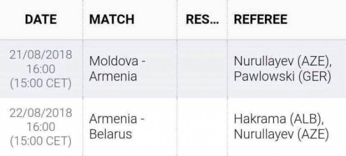 AzVision.az-ın məlumatına görə, "C” qrupunda ev sahibi Moldova ilə yanaşı, Belarus və Ermənistan yığmaları da var. Referimiz avqustun 21-də Moldova - Ermənistan, avqustun 22-də isə Ermənistan - Belarus matçında hakimlik edəcək.