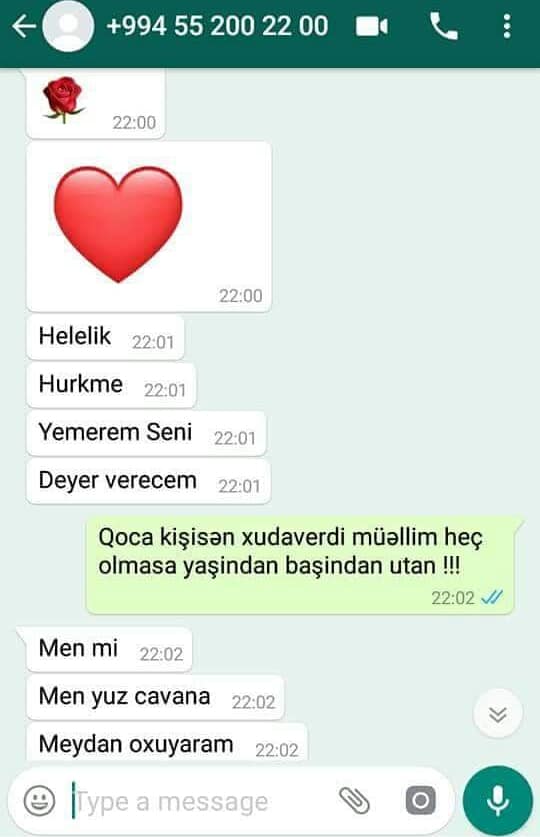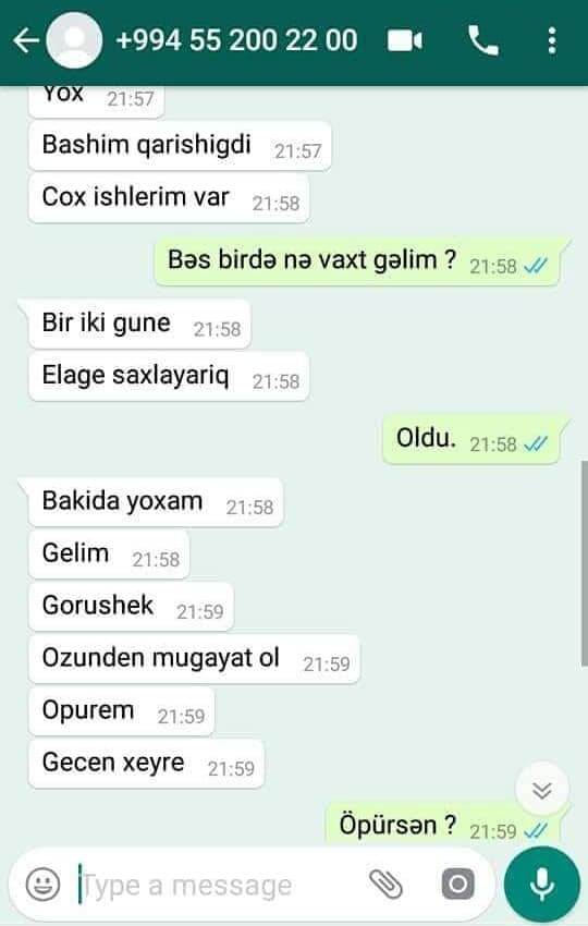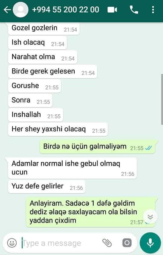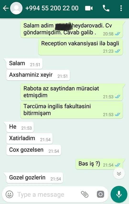 GoldNews.az xəbər verir ki, xanım iş elanı ilə bağlı təqdim edilən əlaqə telefonuna vatsapla mesaj yazıb. Aldığı cavablar isə qadını şoka salıb. İşə götürən şəxs xaınımı görüşə çağırıb. Həmin şəxsin yazdığı mesajlardan qəzəblənən qadın yazışmaların fotolarını və Xudaverdi adlı şəxsin şəklinin sosial şəbəkədə paylaşıb. Sözügedən fotolar sosial medaiada geniş müzakirələrə səbəb olub.