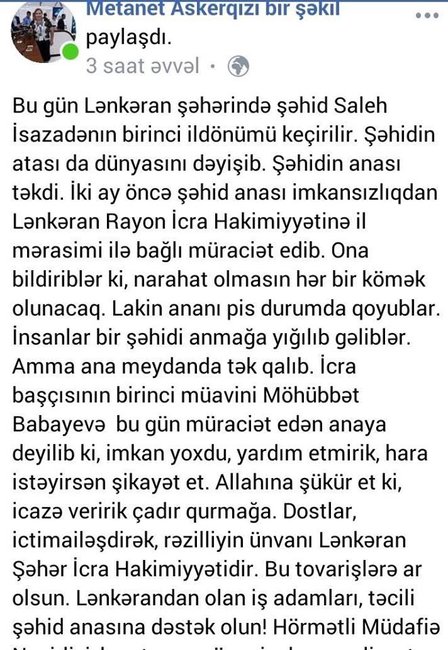 Bu gün Lənkəran şəhərində şəhid Saleh İsazadənın birinci ildönümü keçirilir. Şəhidin atası da dünyasını dəyişib. Şəhidin anası təkdi. İki ay öncə şəhid anası imkansızlıqdan Lənkəran Rayon İcra Hakimiyyətinə il mərasimi ilə bağlı müraciət edib. Ona bildiriblər ki, narahat olmasın hər bir kömək olunacaq. Lakin ananı pis durumda qoyublar. İnsanlar bir şəhidi anmağa yığılıb gəliblər. Amma ana meydanda tək qalıb. İcra başçısının birinci müavini Möhübbət Babayevə bu gün müraciət edən anaya deyilib ki, imkan yoxdu, yardım etmirik, hara istəyirsən şikayət et. Allahına şükür et ki, icazə veririk çadır qurmağa. Dostlar, ictimailəşdirək, rəzilliyin ünvanı Lənkəran Şəhər İcra Hakimiyyətidir. Bu tovarişlərə ar olsun. Lənkərandan olan iş adamları, təcili şəhid anasına dəstək olun! Hörmətli Müdafiə Nazirliyi, bu utanca görə siz də məsuliyyət daşıyırsınız.