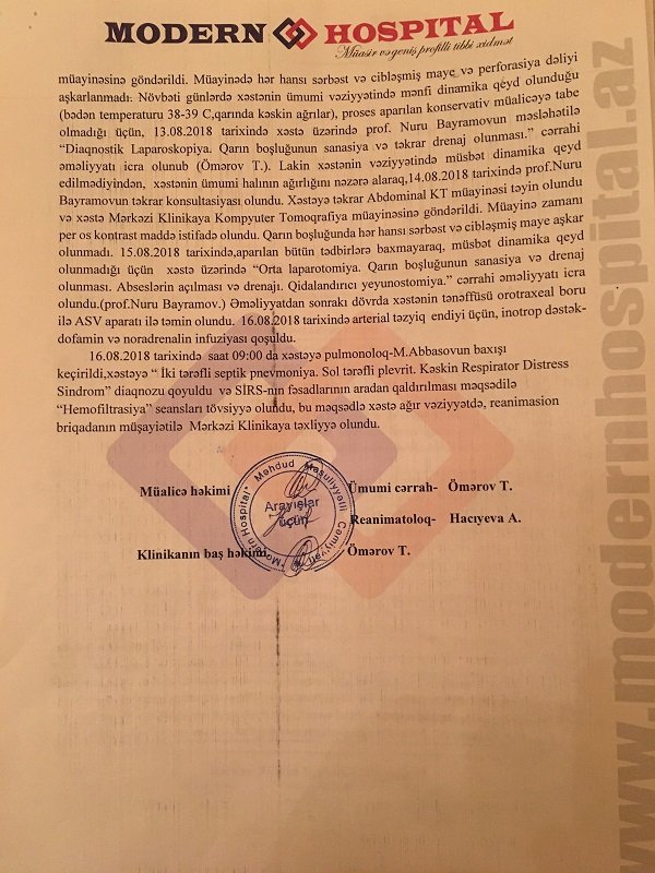 Ağrılar kəsmir, həkim bu dəfə əməliyyat zamanı tibbi alətlərdən xəstənin mədəsində 3mm-lik deşik yarandığını deyir. Ağrı kəskinləşir, növbəti gün xəstənin mədəsinin əməliyat sonrası burulmasının baş verdiyini söyləyirlər. Beləcə təxminən 2 həftə keçir və hər gün yeni bir bəhanə səsləndirilir.
