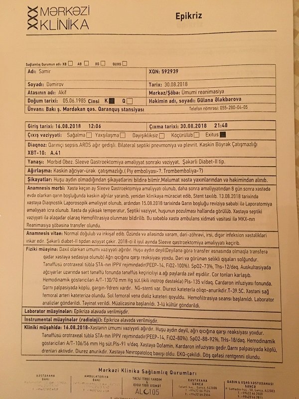 Samir 160 kiloya yaxın çəkidə olub. Amma əməliyyatdan 1-2 gün əvvəl edilən müayinələrdə onda heç bir xəstəlik aşkarlanmayıb. Gözüyaşlı ana deyir ki, iki uşaq atası olan oğlunun ölümündən sonra istintaqa təqdim edilən analizlərin nəticəsindən ikinci dəfə şok yaşayıb. Yazılıb ki, Samir bir neçə xəstəlikdən, eləcə də şəkərdən əziyyət çəkirmiş. "Klinikada 6 gün qaldı, sonra evə buraxıldı. Qarnında kəskin ağrı başladığından səhəri gün klinikaya getdi. Həkim dedi ki, ağrını köp verir, əməliyyatdan sonra köp yaranması təbiidir", -şikayətçilər əlavə edirlər.