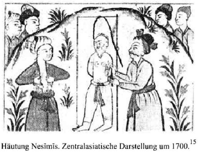 "Şəkildə Nəsiminin edam edildiyi görülür. Hess yazır ki, dərisini soyaraq edam etmək hətta orta əsrlər ənənələrinə görə də qeyri-adi edam növü idi, görünür, belə dəhşətli ölümlə xalqın hürufiliyə get-gedə artan meyilinin qabağını almaq istəyiblər. Hessə görə, əgər təsvir həqiqəti əks etdirirsə, onda ola bilsin, Nəsimini diri-diri yox, Nəsimidən təxminən min il qabaq yaşayan, manixeizmin qurucusu Mani kimi, edam etdikdən sonra dərisini soyublar. Yeri gəlmişkən, akademik Ziya Bünyadov Nəsiminin ancaq üzünün dərisinin soyulduğunu yazır”. (Kult.az)