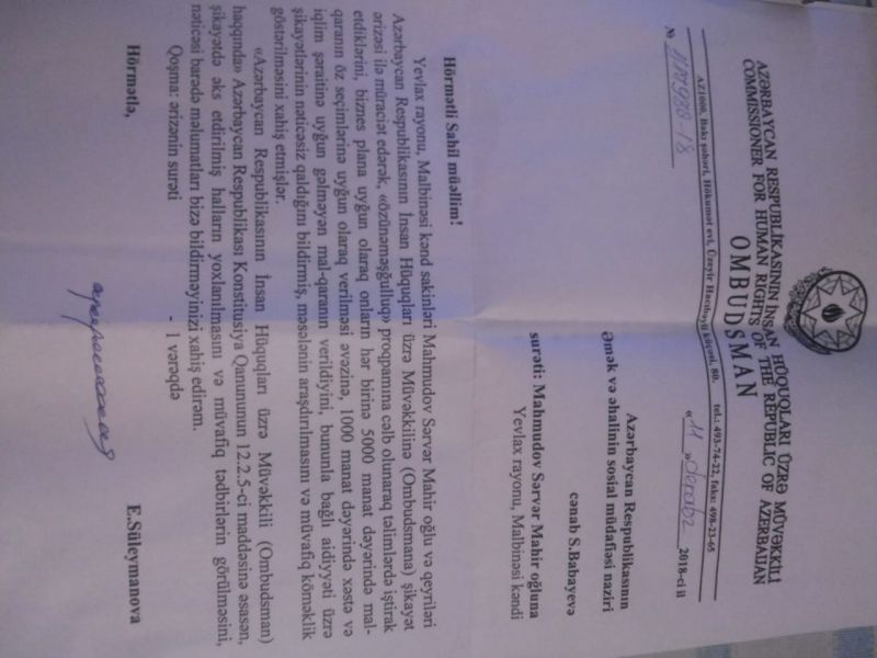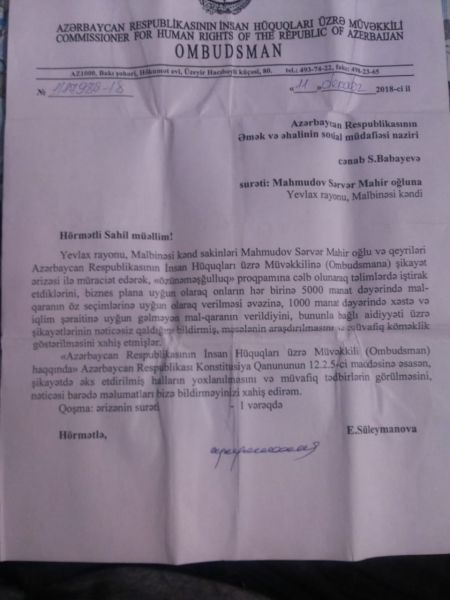 "Nazirliyin bu işlə məşğul olan dələduz adamları həmin balalı heyvanları bir-birindən ayıraraq, balasını da başqa adamlara satırlar. Təsəvvür edin ki, bir xəstə inəyi mənə 2500 manata verirlər. Halbuki, bu pula 3 baş iribuynuzlu sağlam heyvan almaq olar. Mən bununla bağlı ölkə Prezidentinə, Ombudsmana və Prokurorluğa da şikayət göndərmişəm. Əmək və Əhalinin Sosial Müdafiəsi Nazirliyinin əməkdaşları bu qədər açıq korrupsiya əməlləri ilə məşğul olurlar".