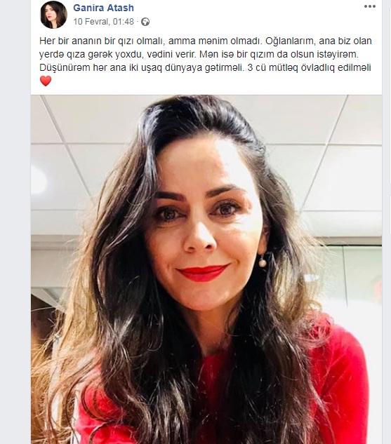 Məşhur aparıcı Qənirə Ataşova qız övladı ilə bağlı status paylaşıb.