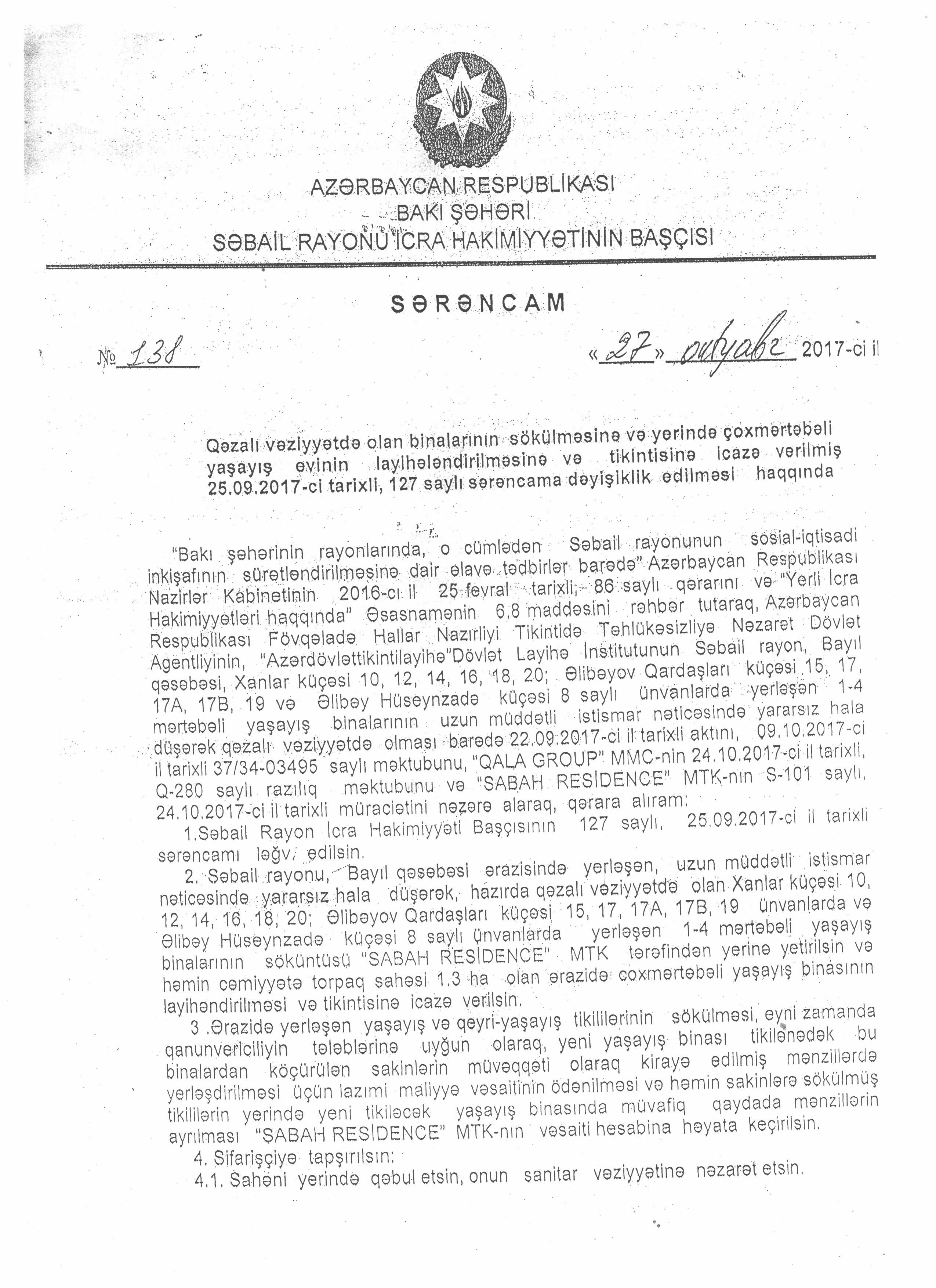 Məsələ ilə bağlı "Sabah Rezidence” MTK-ya müraciət etdik. MTK-ya ünvanladığımız məktuba elektron poçt vasitəsilə verilən cavabda bildirilir ki, Azərbaycan Respublikası Nazirlər Kabinetinin "Bakı şəhərinin Suraxanı, Nəsimi, Xətai, Nərimanov, Nizami, Yasamal, Səbail, Pirallahı, Xəzər rayonlarının sosial-iqtisadi inkişafının sürətləndirilməsinə dair əlavə tədbirlər barədə” 25 fevral 2016-cı il tarixli 86 saylı qərarına və Bakı şəhəri Səbail rayon İcra Hakimiyyəti başçısının 25 sentyabr 2017-ci il tarixli, 127 saylı sərəncamı ilə "Qala Group" MMC-yə həvalə edilmişdir. Sonradan Səbail rayon İcra Hakmiyyəti Başçısının 27 oktyabr 2017-ci il tarixli, 138 saylı sərəncamı ilə 25 sentyabr 2017-ci il tarixli, 127 saylı sərəncam ləğv edilmiş və həmin sərəncama əsasən həmin binaların sökülməsi, həmin ərazidə çoxmərtəbəli yaşayış binasının layihələndirilməsi və tikintisinin həyata keçirilməsi "Qala Group" MMC-nin həmtəsisçisi olduğu "Sabah Residence” Mənzil-Tikinti Kooperativinə həvalə edilib.