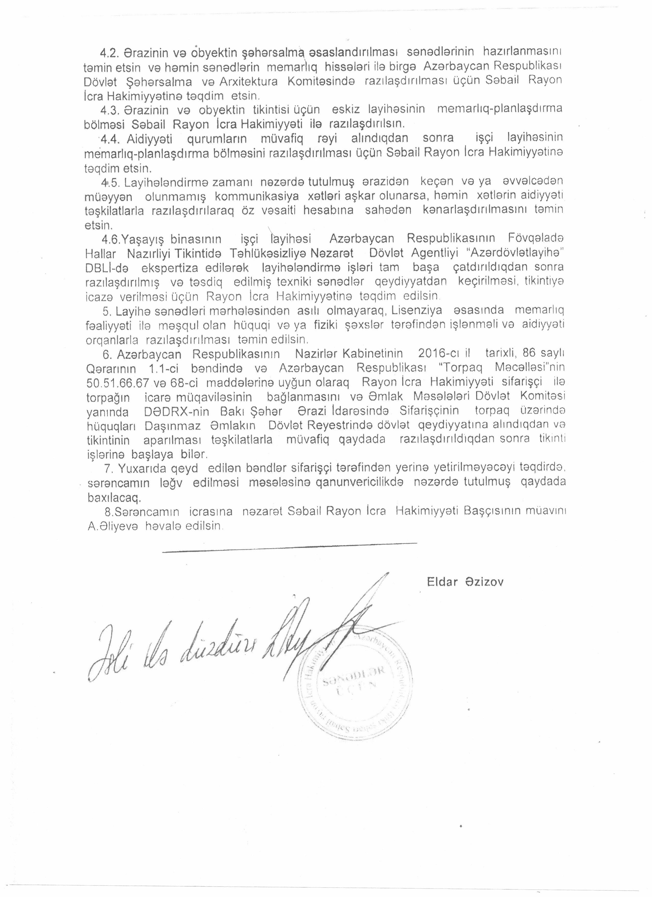 Həmçinin Səbail rayon İcra Hakimiyyəti tərəfindən tikintiyə icazə barədə xüsusi nişan verilib.