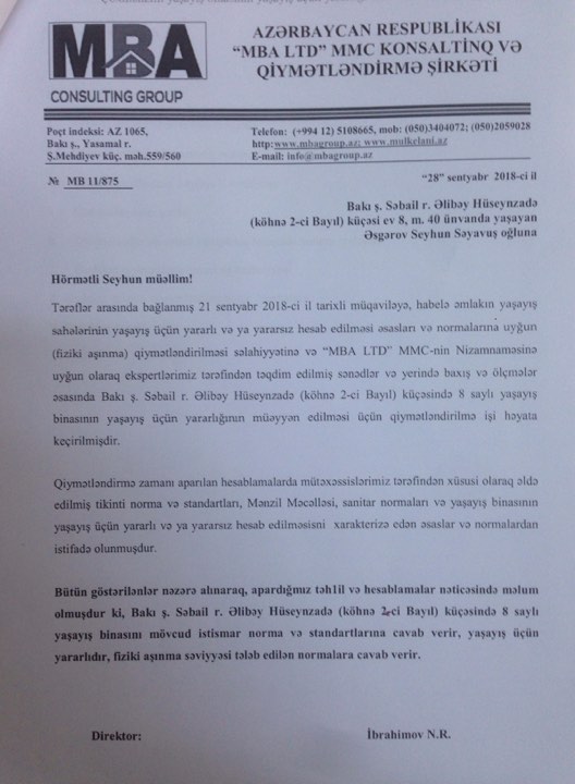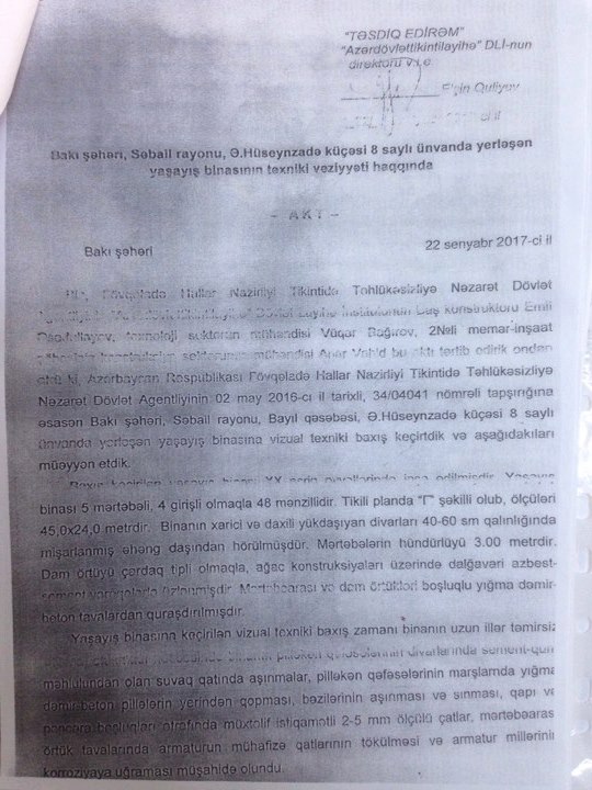 Şikayətçilər deyirlər ki, yaşadıqları binanın yararsız vəziyyətdə olması barədə Azərtikintilayihə Dövlət Layihə İnstitutunun aktı da saxtadır. Belə ki, sakinlər binalarına texniki baxış keçirmək üçün öz vəsaitləri hesabına özəl ixtisaslaşmış "MBA Consulting Group” şirkətinə müraciət edib. Şirkətin gəldiyi rəydə bildirilir ki, Bakı şəhəri Səbail rayonu, Əli bəy Hüseynzadə, 8 ünvanında yerləşən çoxmənzilli yaşayış binasının orta fiziki aşınma göstəricisi 35,66 faiz təşkil edir. Qüvvədə olan normalara görə isə yaşayış binasının fiziki aşınma dərəcəsi 70 faiz və daha yuxarı olduqda bina yaşayış üçün yararsız sayılır.