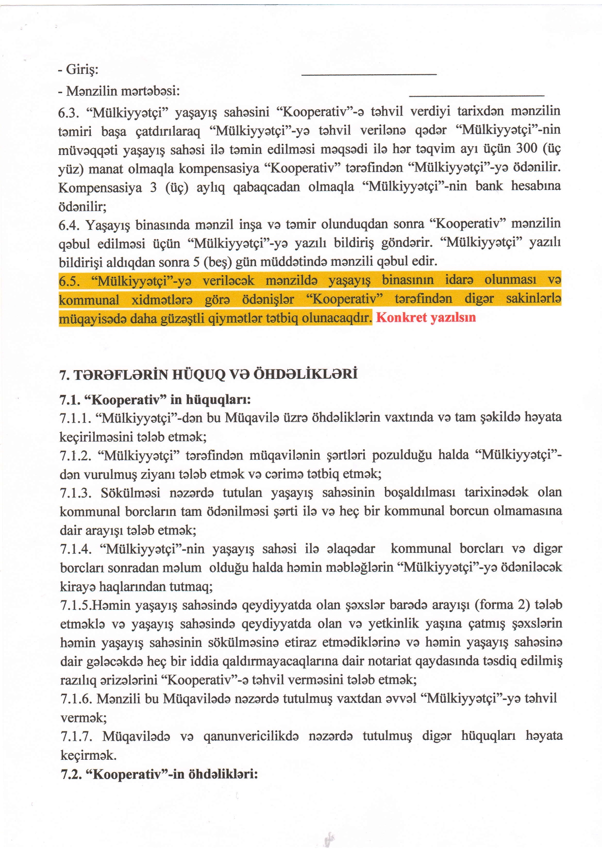 "Əvəzləşmə Müqaviləsi”nin 6.3-cü maddəsinə əsasən"Mülkiyyətçi” yaşayış sahəsini "Kooperativ”-ə təhvil verdiyi tarixdən mənzilin təmiri başa çatdırılaraq "Mülkiyyətçi”-yə təhvil verilənə qədər "Mülkiyyətçi”-nin müvəqqəti yaşayış sahəsi ilə təmin edilməsi məqsədi ilə hər təqvim ayı üçün kompensasiya "Kooperativ” tərəfindən "Mülkiyyətçi”-yə ödənilir. Kompensasiya 3 (üç) aylıq qabaqcadan olmaqla "Mülkiyyətçi”-nin bank hesabına ödənilir.Mənzilin təhvil verilməsi ilə bağlı isə "Tərəflər” arasında "Təhvil-təslim Aktı” imzalanır.