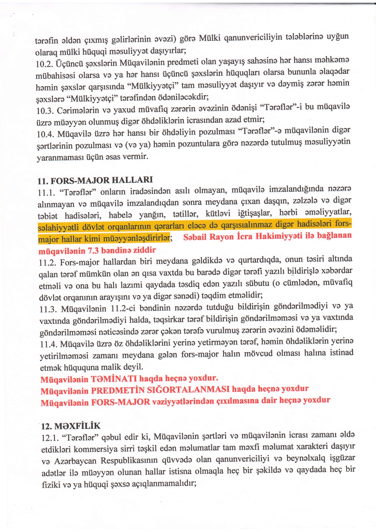 Binanın tikilə bilməyəcəyi və yaxud şirkətin iflasa uğrayacağı təqdirdə evlərini MTK-ya vermiş sakinlər nə edə bilər sualına isə MTK rəhbərliyi icra hakimiyyətinin sərəncamı ilə cavab verdi. Belə ki, həmin sənədin yeddinci bəndində göstərilir ki, sifarişçi icra hakimiyyəti qarşısında öhdəlikləri yerinə yetirməyəcəyi təqdirdə sərəncamın ləgv ediləcəyi məsələsinə qanunvericilikdə nəzərdə tutulmuş qaydada baxılacaq. Amma bunun necə icra olunacağı və belə hal baş verərsə, faktiki mənzilsiz qalan və kirayədə yaşayan sakinin taleyinin hansı formada həll ediləcəyi sərəncamda göstərilməyib.