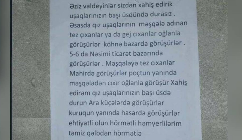 Belə ki, mənbəyi və kimin tərəfindən yazıldığı məlum olmayan elanda valideyinlərə səslənilir, onların qız övladlarına nəzarət olunması xəbərdarlığı edilir. Hətta qeyd edilir ki, müəyyən yerlərdə gənc və azyaşlı qızlar oğlanlarla görüşür, onlara kirayə evlər verilir və s.