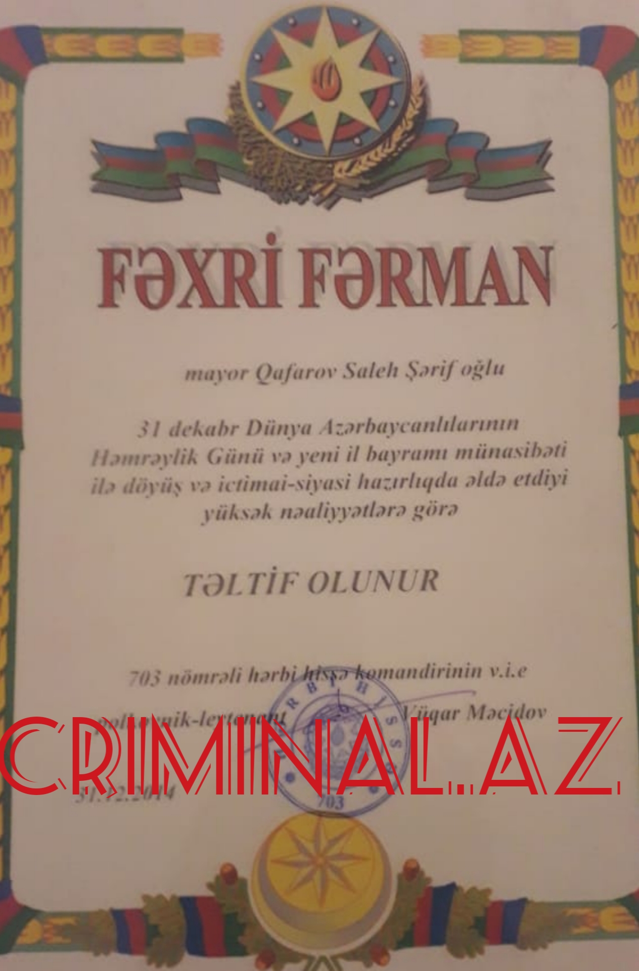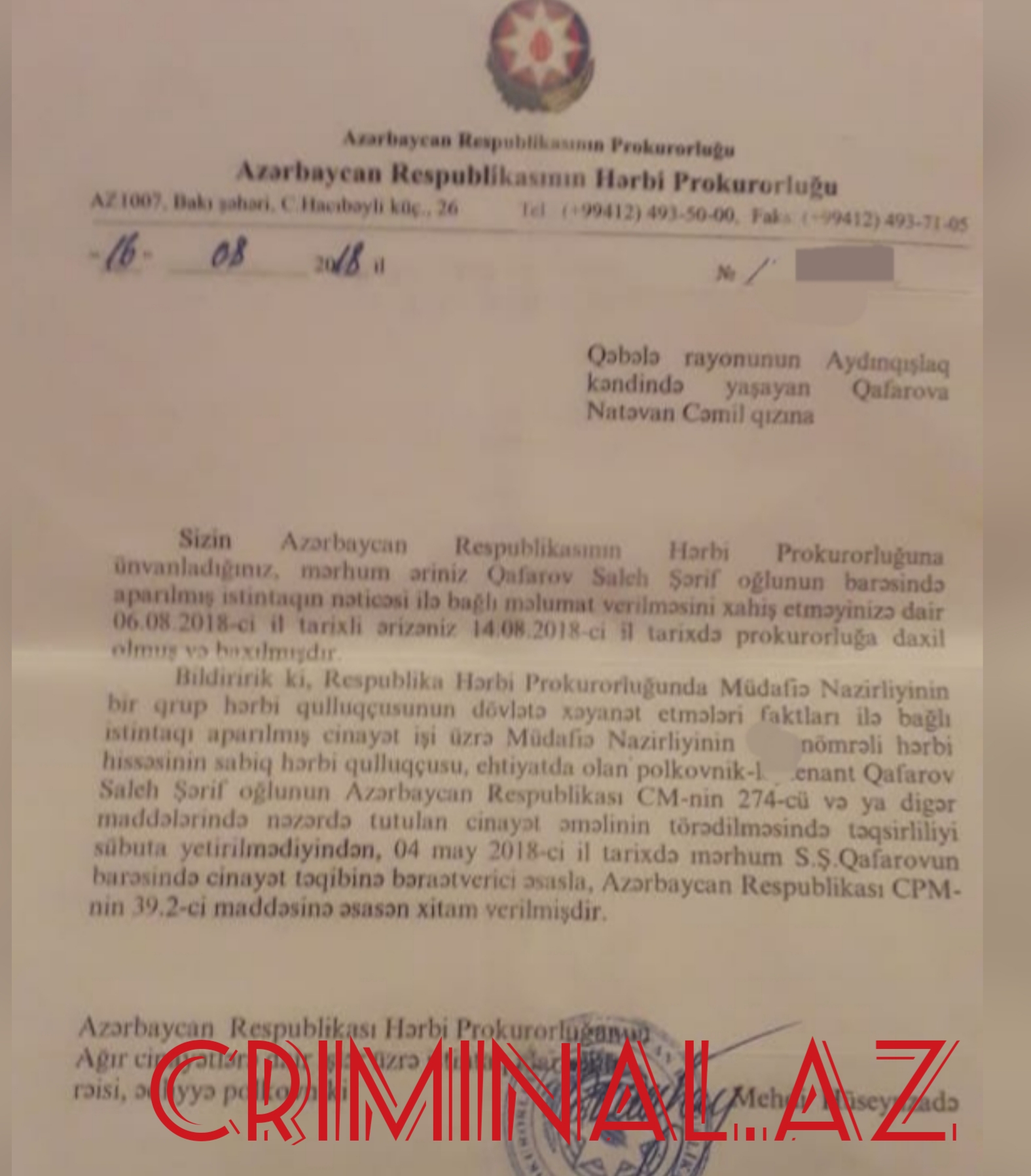 Bəraət hökmündən sitat: "İstintaqı aparılmış cinayət işi üzrə Müdafiə Nazirliyinin N saylı hərbi hissəsinin sabiq hərbi qulluqçusu, ehtiyatda olan polkovnik-leytenant Qafarov Saleh Şərif oğlunun Cinayət Məcəlləsinin 274-cü və digər maddələrində nəzərdə tutulan cinayət əməlinin törədilməsində təqsirliliyi sübuta yetirilmədiyindən 4 may 2018-cü il tarixində mərhum S.Qafarovun barəsində cinayət təqibinə bəraətverici əsasla xitam verilmişdir”.