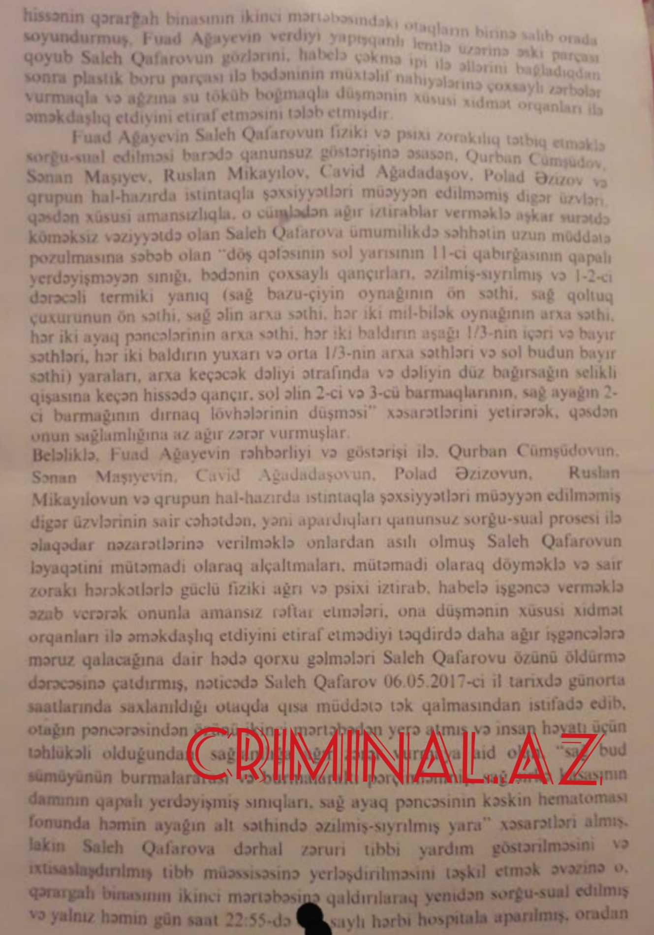 "... işgəncələr S.Qafarovu ölüm həddinə çatdırdığından o, 2017-ci il mayın 6-da günorta saatlarında saxlanıldığı otaqda tək qalmasından istifadə edərək pəncərədən özünü ikinci mərtəbədən atıb”-sənəddə qeyd olunub.