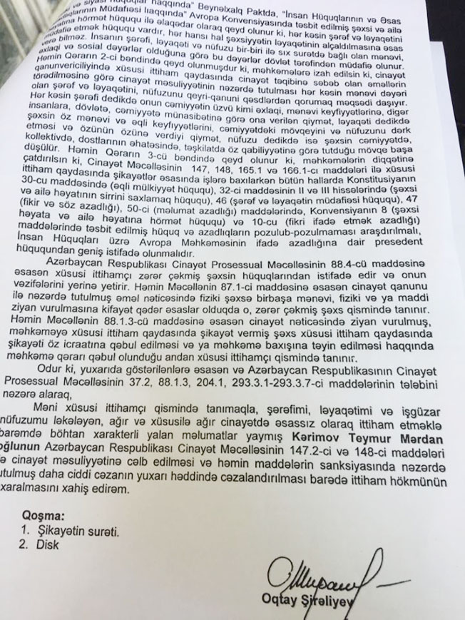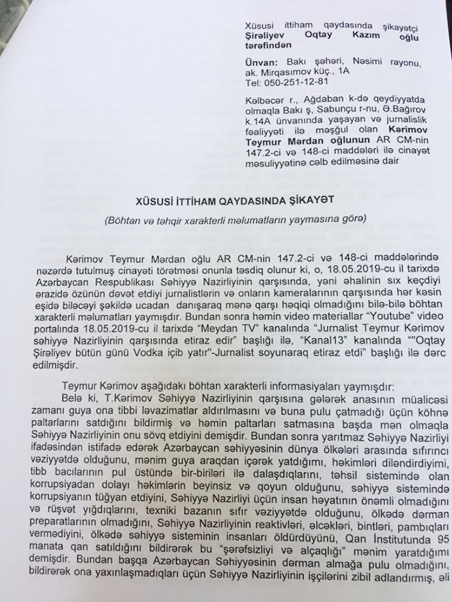 Səhiyyə naziri Oqtay Şirəliyev mayın 18-də nazirliyin binası qarşısında etiraz aksiyası keçirmiş Teymur Kərimovu məhkəməyə verib. Nazir onun Cinayət Məcəlləsinin 147.2 (ağır cinayətdə ittiham etməklə böhtan atma) və 148-ci (təhqir) maddələrinin ən yüksək həddində cəzalandırılmasını tələb edir.