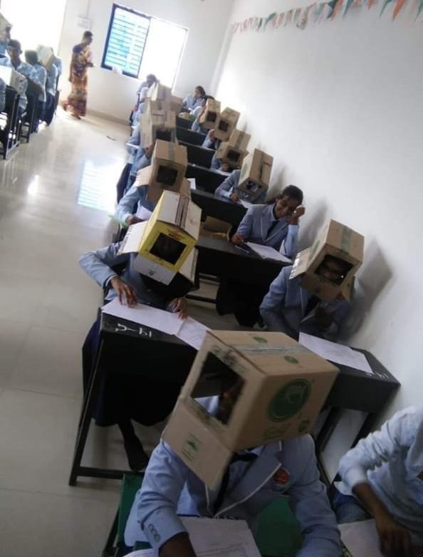 Tələbələrin başlarına qutu keçirib imtahana saldılar — FOTO
