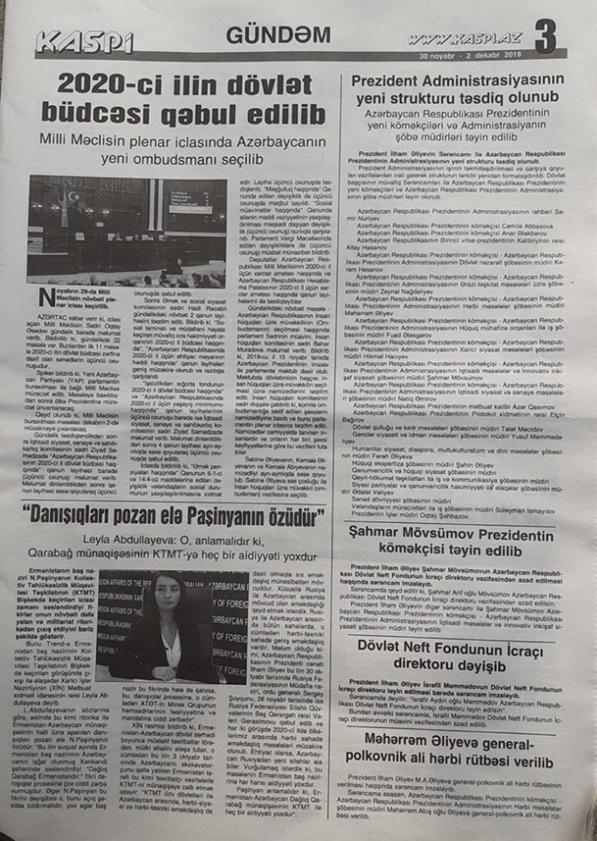 Anews.az "demokrat.az”a istinadən xəbər verir ki, Əli Həsənovun həyat yoldaşı Sona Vəliyevanın təsisçisi olduğu "Kaspi" qəzeti ölkə Prezidentinin bu Sərəncamını dərc etməkdən imtina edib. Qəzetin 30 noyabr tarixli nömrəsində Prezident İlham Əliyevin ayın 29-da imzaladığı Sərəncamlar arasında yalnız Əli Həsənovla qərarı dərc olunmayıb.