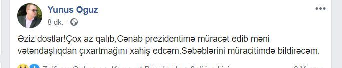 "Əziz dostlar. Çox az qalıb, cənab prezidentimə müracət edib məni vətəndaşlıqdan çıxartmağını xahiş edəcəm. Səbəblərini müraciətimdə bildirəcəm" - baş redaktor qeyd edib.(Pravda.az)