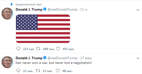 Amerika lideri öz tvitter mikrobloqunda ABŞ bayrağının fotosunu paylaşaraq "İran heç vaxt müharibədə qazanmadı, lakin heç vaxt danışıqları da itirmədi” şərhini yazıb.