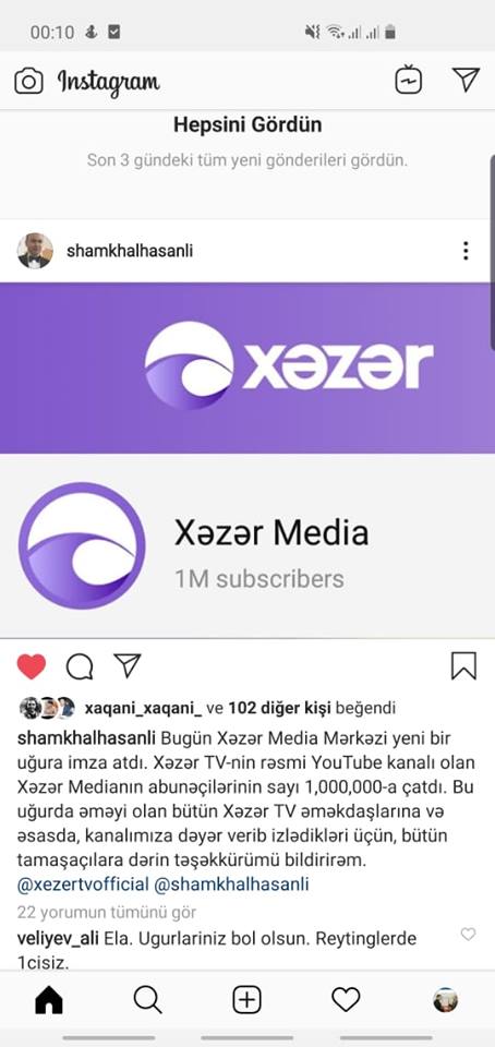 Əli Həsənovun oğlu Xəzər TV ilə bağlı paylaşım etdi - FOTO