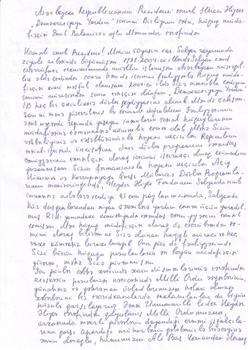 “Demokratiyaya yardım” İB-nin sədri: "Vətənini sevən hər kəs bu gün Sizin əsgərinizdir"Ədliyyə Nazirliyi Penitensiar xidmətinin tabeliyindəki Bakı İstintaq Təcridxanasında saxlanılan şəxs Emil Məmmədov təcridxananın rəhbərliyi vasitəsilə Azərbaycan Respublikasının Prezidenti cənab İlham Əliyevə müraciət edib.Emil Balamirzə oğlu Məmmədov “Demokratiyaya yardım” İctimai birliyinin sədri, hüquq-müdafiəçisi olub.ANS PRESS xidmətə istinadən müraciəti təqdim edir."Hörmətli cənab Prezident!Mənim 50 yaşım var. Salyan rayonunda ziyalı ailəsində böyümüşəm. 1987-2004-cü illərdə Salyan Kənd Təsərrüfatı Texnikumunda müəllim işləmişəm. Azərbaycan müstəqillik əldə etdikdən sonra həm də ictimai fəaliyyətlə hüquq müdafiəçiəsi kimi məşğul olmuşam. 2007-ci ildə Sizə məktubla etdiyim səmimi müraciətdən sonra təsisçisi olduğum “Demokratiyaya yardım” İB heç bir çətinliksiz dövlət qeydiyyatına alınıb. Mən də çalışmışam ki, mənə göstərilmiş bu etimadı doğruldum.Fəaliyyətimin əsas məqsədi regionda yaşayan insanların sosial hüquqlarının müdafiəsinə təmənnasız köməklik etmək olub. Məhz Sizin rəhbərliyiniz və təşəbbüsünüzlə həyata keçirilən regionların sosial-iqtisadi inkişafına olan dövlət proqramının vətəndaş cəmiyyətinin təmsilçisi olaraq ictimai iştirakçı olmaq etimadını qazanmışam. Sizin fərmanınızla həyata keçirilən Açıq Hökumət və Korrupsiyaya qarşı Mübarizə Dövlət Proqramlarının monitorinqində Heydər Əliyev Fondunun Salyanda tikib imkansız ailələrə verdiyi 85 evin paylanmasında, Salyanda Kür daşqınlarından ziyan çəkənlərə yardım etmək üçün yaradılmış RİH yanındakı komissiyada vətəndaş cəmiyyətini təmsil etmişəm. Mən hüquq müdafiəçisi olaraq öz təcrübəmdən səmimi olaraq bilirəm ki, Sizə olunan haqlı müraciət heç vaxt köməksiz buraxılmayıb. Ona görə də fəaliyyətimdə Sizi bütün hüququ pozulanların ən böyük müdafiəçisi görürəm, məhz Sizə güvənirəm.Son günlər cəbhə xəttində xain düşmənlərimiz tərəfindən atəşkəsin pozulması nəticəsində Milli Ordu əsgərlərinin, günahsız və qəhrəman övladlarımızın həlak olması xəbərlərini biz təcridxanalarda saxlanılanlar da böyük hüznlə qarşılayırıq. Əsası Ümummilli lider Heydər Əliyev tərəfindən qoyulmuş Milli Ordumuzun, arxasında məkrli qüvvələrin dayandığı erməni işğalçılarına qarşı apardığı müharibənin qələbəmizlə bitəcəyinə əmin olmaqla, hamımızın ali baş komandan olaraq Sizin arxanızda olduğunu bildirirəm. Vətənini sevən hər kəs bu gün Sizin əsgərinizdir.Hörmətli cənab Prezident!Mən düşmən dəyirmanına su tökənlərdən fərqli olaraq Sizi Respublikamızın inkişafı və tərəqqisi naminə apardığınız siyasəti bir vətəndaş və hüquq müdafiəçisi olaraq həmişə dəstəkləmişəm və bundan sonra da dəstəkləyəcəyəm".