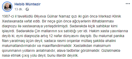 "Sədərəkdə kiçik sahibkar kimi işləyirdi. Sədərəkdə Çin mallarının sıx satıldığı yer idi. Həkim xəstə yaxınlarına deyib ki, eyni diaqnozla artıq 12 nəfər dünyasını dəyişib. Bu məlumat panika filan yaratmaq üçün deyil, sadəcə rəsmi orqanlar mütləq şəkildə əhalini məlumatlandırmalıdır və maarifləndirməlidir. Xəstəlikdən maksimum qorunmanın yollarını anlatmalıdır, əlavə tədbirlər görülməlidir. Gizlətməklə nəsə etmək çıxış yolu deyil, bunu illərdir deyirik", - deyə o əlavə edib.