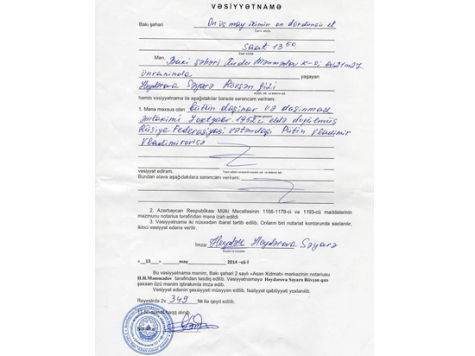 Bakı sakini Heydərova Səyyarə Rövşən qızı bütün var-dövlətini Rusiya prezidenti Vladimir Putinə vəsiyyət edib.Bu barədə AzVision.az Rusiya KİV-nə istinadən xəbər verir. Bakının 40 yaşlı sakininin bu hərəkəti həm Azərbaycan, həm də Rusiyada böyük maraqla qarşılanıb. Azərbaycanın xüsusi xidmət orqanlarının əməkdaşları bildiriblər ki, Səyyarənin atası “KQB”də polkovnik olub. O, həmçinin Rusiya prezidenti Vladimir Putinlə yaxın əlaqlərə malik olub. Azərbaycanın xüsusi xidmət orqanlarının əməkdaşları Səyyarənin bu hərəkətini məhz bu faktla izah edirlər.Səyyarə Heydərova isə məsələ ilə bağlı açıqlama verərkən ilk növbədə ağlı başında biri olduğunu və ruhi xəstə olmadığını vurğulayıb.Qeyd edək ki, 40 yaşlı Bakı sakininin ailəsi və qohumları yoxdur.