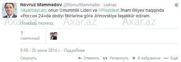 “Azərbaycan, onun Ümummilli Lideri və Prezident İlham Əliyev haqqında «Россия 24»də dediyi fikirlərinə görə, Jirinovskiyə təşəkkür edirəm”.