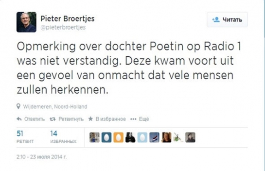 Mer Putinin qızının deportasiyasını istəyirdiHollandiya meri Rusiya prezidenti Vladimir Putindən üzr istəyib.ANS PRESS-in məlumatına görə, mer Piter Broertes Putinin qızının deportasiya edilməsini təklif etdiyinə görə üzrxahlıq edib. Hilversum şəhərinin meri bu addımına görə sonradan sosial şəbəkədə şərh də yazıb.Brortes Putinin 29 yaşlı qızı Mariyanın ölkədən çıxarılması ilə bağlı "Radio 1"-in səhər verlişində bildirib. Mer efir zamanı bildirib ki, Rusiya prezidentinin qızı Hollandiyanın cənubunda yaşayır: "Ancaq Mariyanın rəsmən Hollandiyada yaşaması faktı təsdiq edilməyib. Yalnız o məlumdur ki, Mariya holland vətəndaşı Yorittom Faassenomla nigahdadır".Bu çıxışının böyük əks səda doğurduğunu görən mer sonradan üzr istəməli olub. Merin bu addımı "Boing 777"-nin qəzaya uğraması ilə əlaqədar olub. Belə ki, 17 iyulda Donetskdə 298 insan həlak olub. Hadisə nəticəsində ölənlərin 154-ü holland vətəndaşıdır.