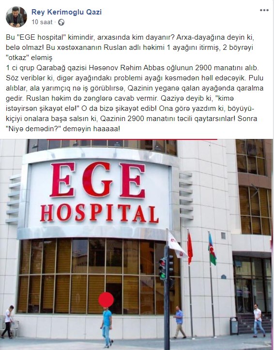 Bu "EGE hospital" kimindir, arxasında kim dayanır? Arxa-dayağına deyin ki, belə olmaz! Bu xəstəxananın Ruslan adlı həkimi 1 ayağını itirmiş, 2 böyrəyi "otkaz" eləmiş