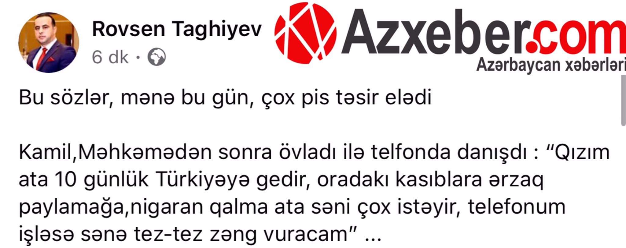 Kamil məhkəmədən sonra övladı ilə telefonda danışdı: Qızım ata 10 günlük Türkiyəyə gedir, oradakı kasıblara ərzaq paylamağa, nigaran qalma. Ata səni çox istəyir, telefonum işləsə sənə tez-tez zəng vuracam”